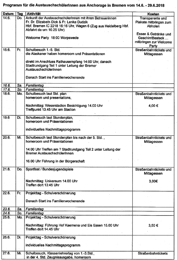 12 Alaskans besuchten im Juni 2006 unsere Schule und wohnten bei den Familien der jeweiligen Partner. Und am 3. Oktober 2006 war es dann endlich so weit - eine Gruppe von zwölf Schülerinnen und Schüler unserer Schule flog über den großen Teich, um drei Wochen am Unterricht der Partner teilzunehmen. Sie wurden von den amerikanischen Familien herzlich aufgenommen. Besichtigungen und Ausflüge in die atemberaubende Natur Alaskas waren Teil des Programms. Einen attraktiven Abschluss des Programms stellte sicherlich der Aufenthalt in New York dar.