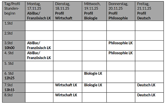 Anmeldung: Bitte meldet euch für eure Hospitation vorher an. Dies geht per Mail an Frau Neunhöffer und Herrn Köster, das Oberstufenteam. Wir bieten dieses Jahr nur einen Tag zum Hospitieren in bestimmten Profilen an, außerdem nur in den Profilen, in denen ihr eine Chance habt, bei uns einen Platz zu bekommen. Bitte gebt bei der Anmeldung an, welches Profil ihr besuchen möchtet. Die Hospitationen finden je nach Profil zu unterschiedlichen Anfangszeiten statt (Tabelle unten beachten, Beginn immer zu Anfang der Doppelstunde!). Bitte seid eine Viertelstunde vor Beginn der Hospitation am Infostand im Foyer und holt euch die Informationen zur Hospitation ab. Bitte habt Verständnis, dass es nur eine begrenzte Anzahl an Plätzen gibt. Nur mit einer bestätigten Anmeldung ist eine Hospitation möglich.